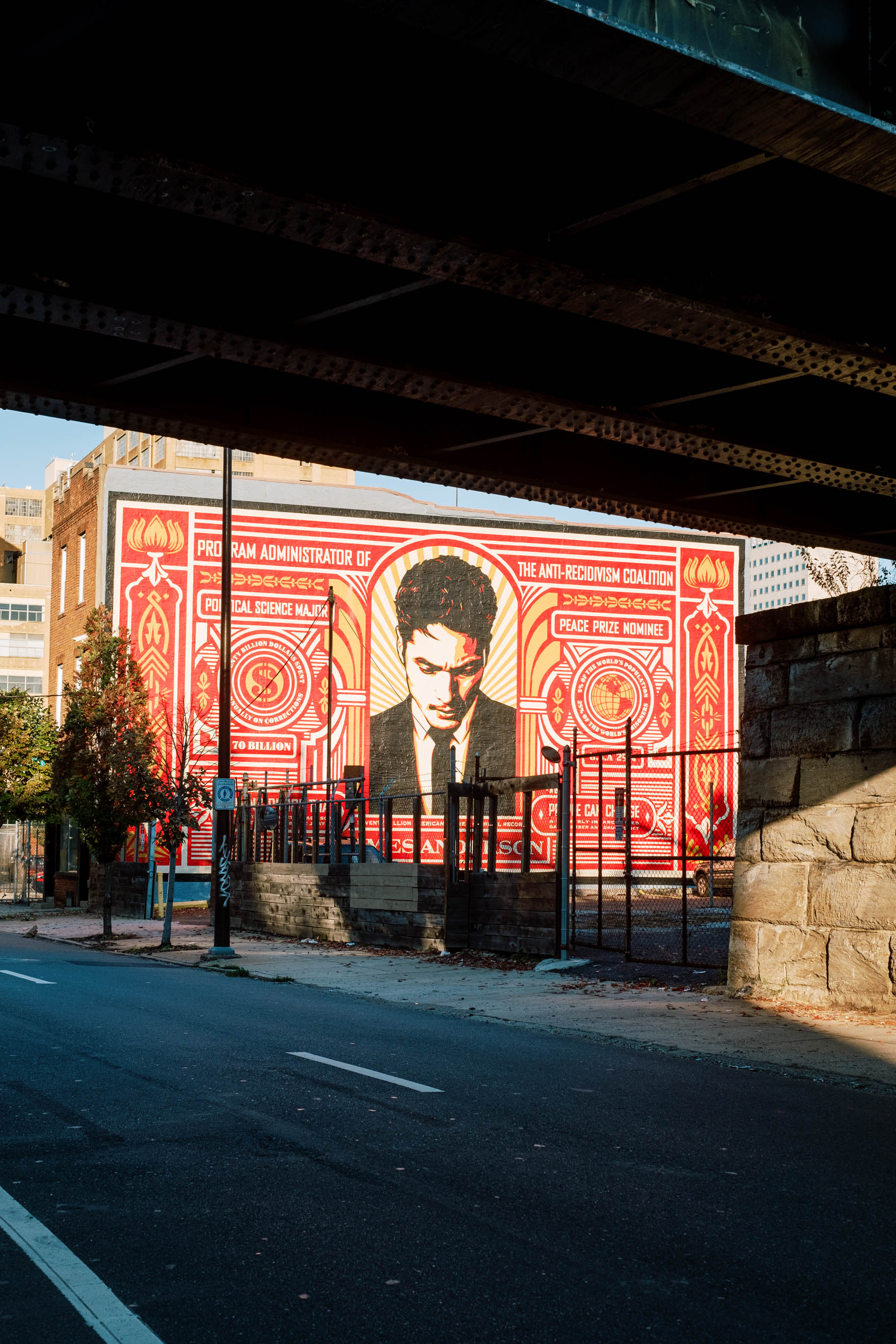 Stamp of Incarceration was created by Shepard Fairey as a part of the Open Source Exhibition in collaboration with the Mural Arts Restorative Justice Program. The mural features James Anderson, a human rights activist and Program Administrator at The Anti-Recidivism Coalition. The portrait is based on a photo by Barbara Davidson. This mural is one of two in a series by Fairey that centers on prison reform and mass incarceration, de-stigmatizing incarceration by highlighting the stories of people who have returned from prison and become integral members of society.